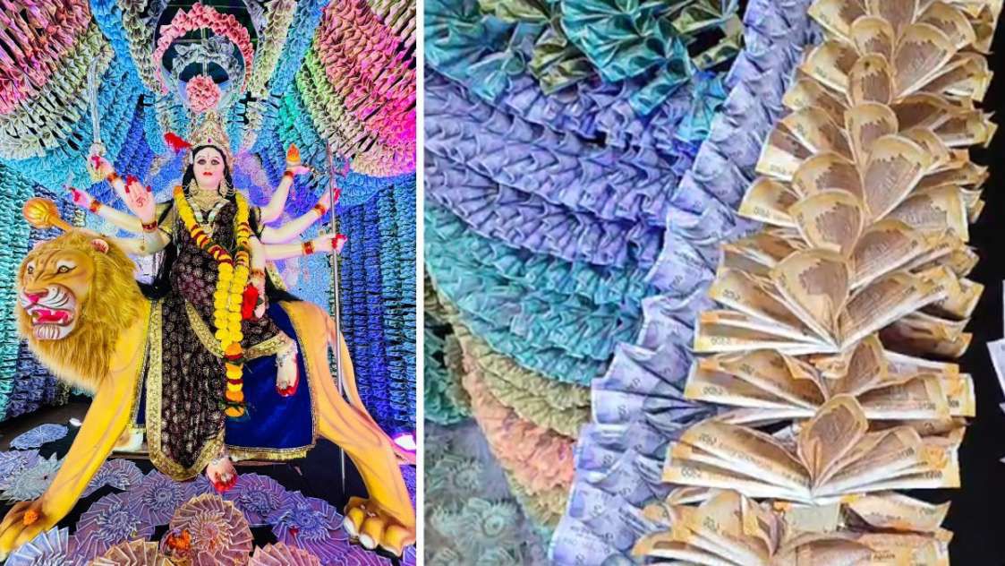मंडप की सजावट की खास बात यह है कि बाहर से आए कलाकारों ने 50 से 500 रुपये तक के नोटों की झालरें बनाकर पूरे मंडप को सजा दिया है, जिसके बीचों-बीच माता रानी की प्रतिमा स्थापित है.